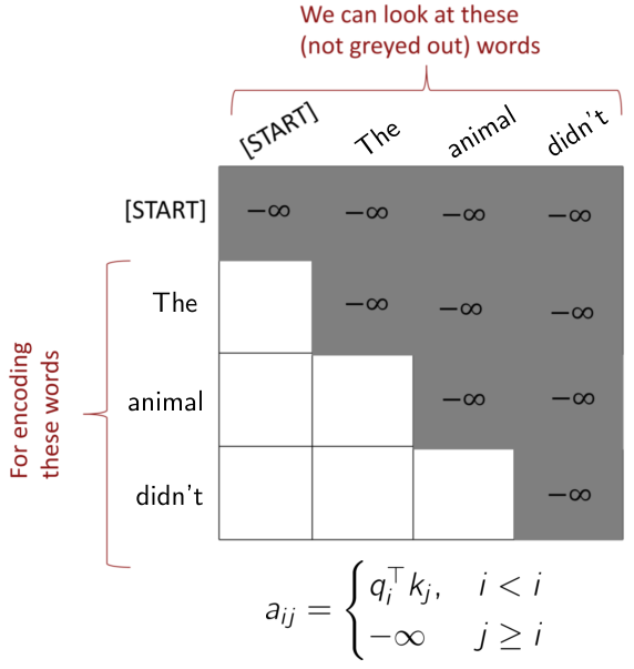 따라서, Decoder에서의 self-attention은 계산적인 효율성을 위해 encoder에서 수행한 self-attention과 같은 식으로 구현을 하되, 미래 시점의 data를 참조하지 못하도록 masking을 한다. 이러한 방식을 masked self-attention이라고도 한다. 일반적인 masking 방법은 미래 시점의 data를 모두 -inf로 적용하여 해당 token의 attention output 값을 0으로 만들어버리는 방법이다.