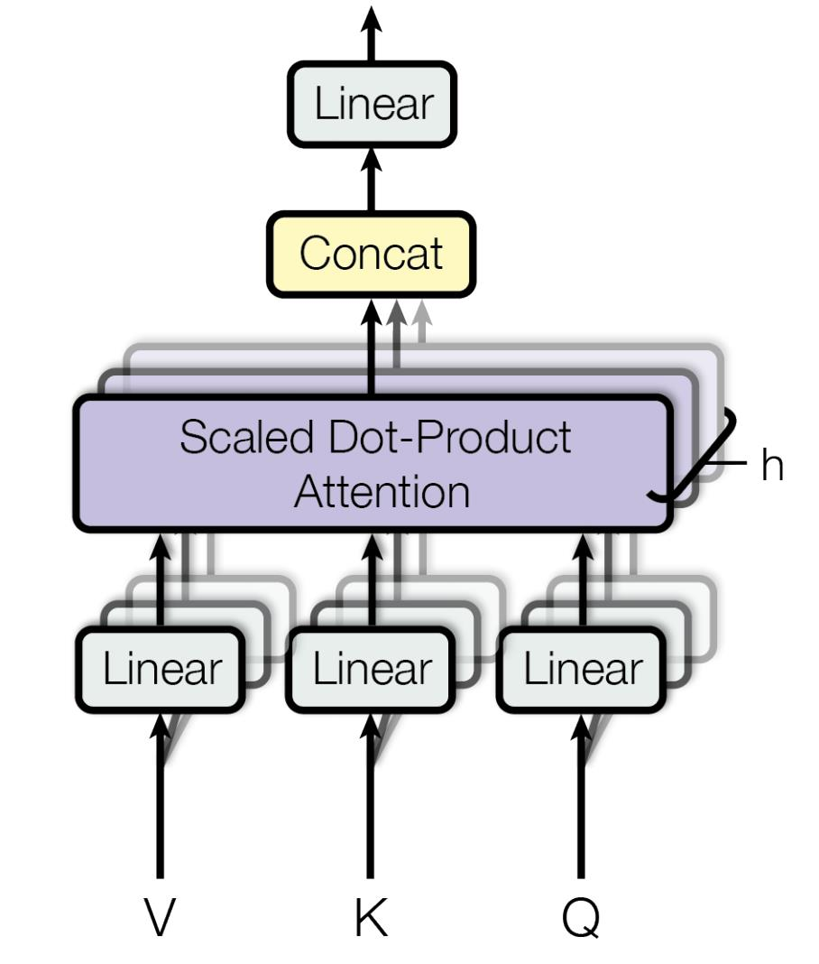 CNN에서의 multi-channel 개념을 self-attention에도 적용할 수 있다. CNN에서 channel의 수를 늘림으로써, 다양한 정보를 뽑아낼 수 있었던 것처럼, self-attention 시에도 복수개의 head를 두어 다양한 정보를 뽑아낼 수 있다. 이러한 기법을 multi-head attention이라고 한다. 일반적으로 각 attention head를 거쳐 생성된 output은 concatenate되어 linear layer의 input으로 투입된다.