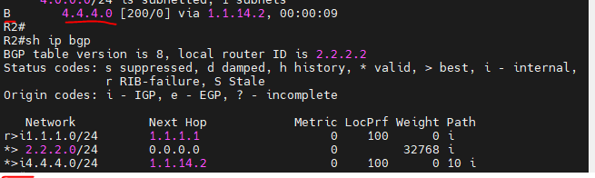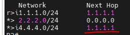 1.1.1.0 대역은 eigrp로 학습되어있기 때문에 AD값이 밀려 bgp로 표시되지않고, bgp 테이블에 r로 표시됨