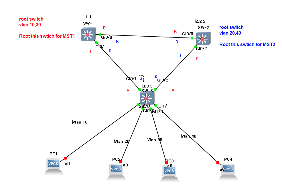 SW-1을 MST 인스턴스 1의 루트 브리지로 설정