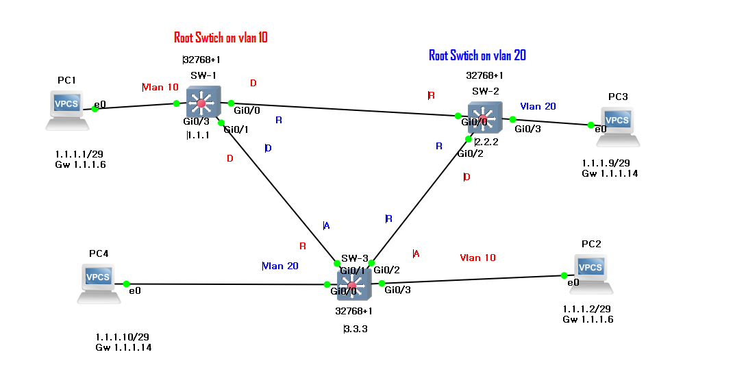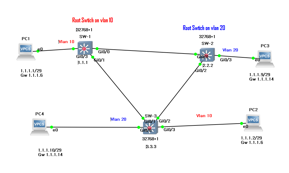 SW1은 VLAN 10의 루트 스위치, vlan 20을 보조 루트 스위치로 설정