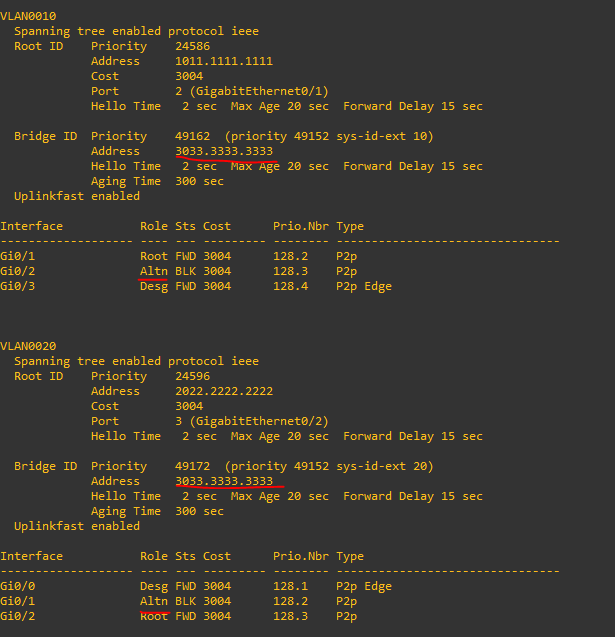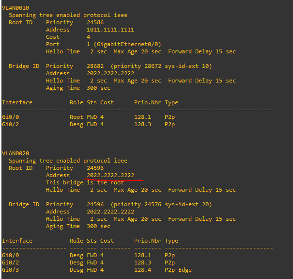 SW2은 VLAN 20의 루트 스위치, vlan 10을 보조 루트 스위치로 설정