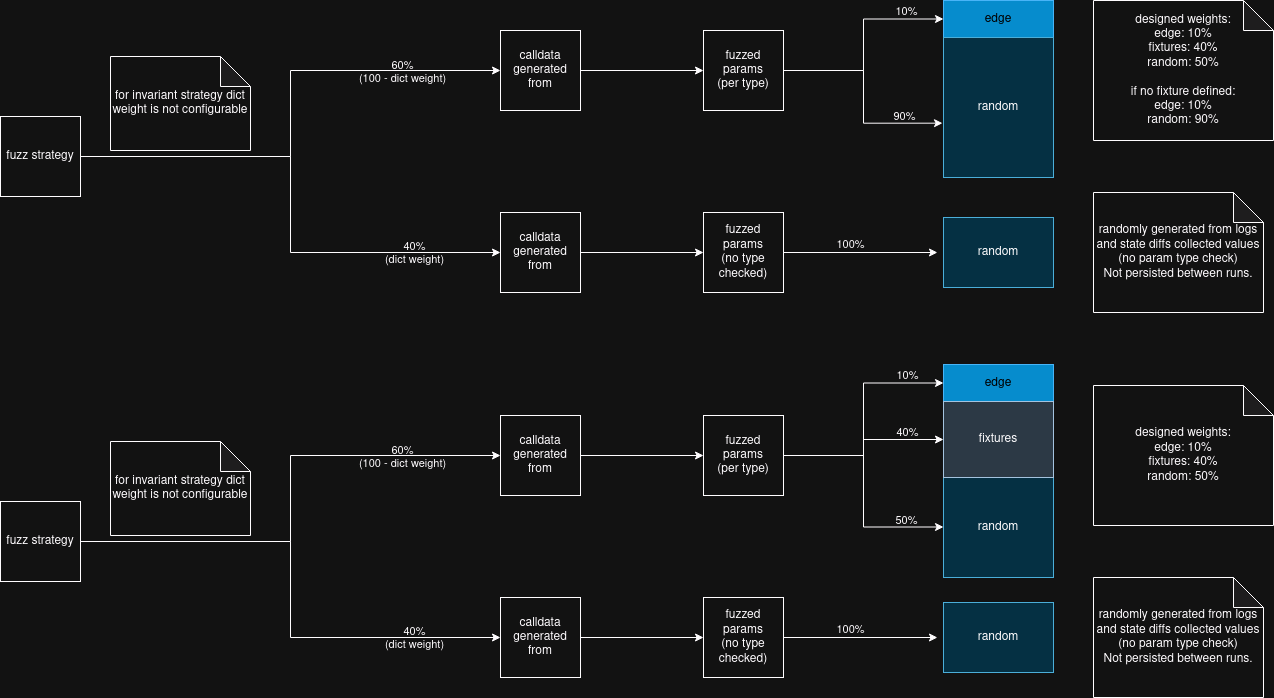 runs : Fuzzer가 테스트한 시나리오의 수 (일반적으로 256개지만, 수정 가능)μ : 해당 뮤는 퍼징 실행에서 사용한 평균 gas양을 나타낸다.~ : 해당 틸드는 모든 퍼징 실행에 사용한 중앙 gas양이다.Fuzzing 테스트할때 Fixtures 라는게 존재하는데, 퍼징 매개변수로 사용될 입력 값의 집합을 명시적으로 지정하고 싶을 때 정의할 수 있다.