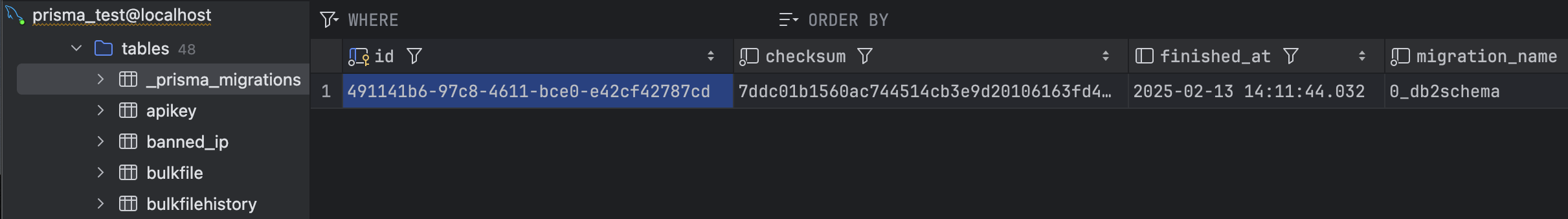 _prisma_migrations 테이블이 생성되며, 마이그레이션 정보는 해당 테이블에 적용되어 마이그레이션 이력을 관리하게 된다$ npx prisma db pull