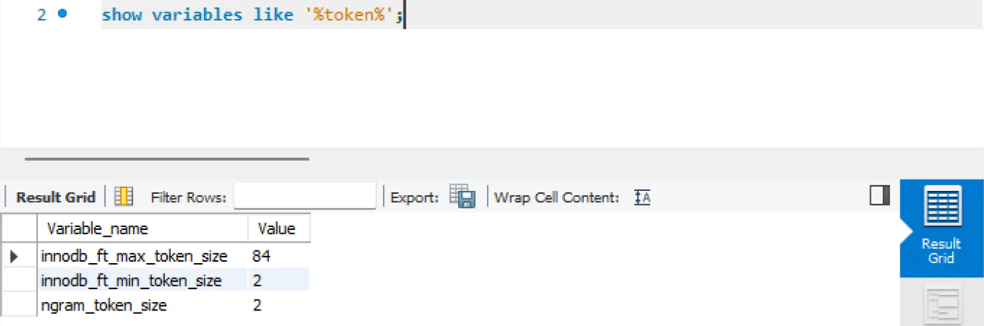 아래의 명령어를 직접 입력해서 이제 FULLTEXT 인덱스를 만들면 토큰 크기가 2짜리 전문 검색 인덱스를 만들 수 있다.