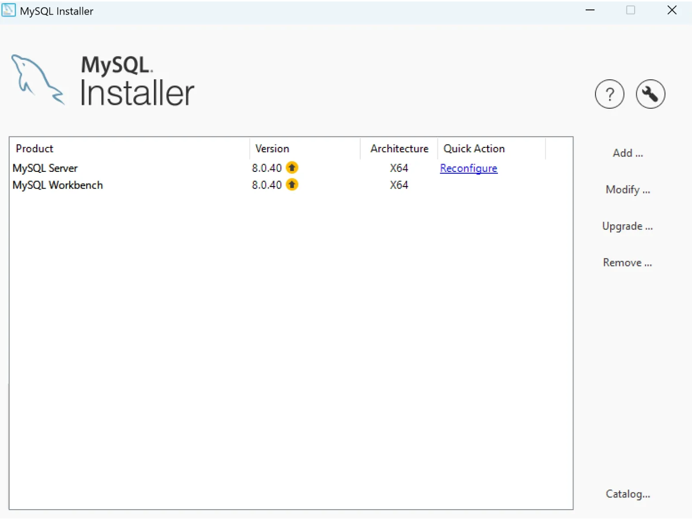 이제 MySQL installer를 들어가서 다음과 같은 페이지에서 reconfigure를 누르고 계속 다음으로 넘어가면 서버를 재시작할 수 있다.