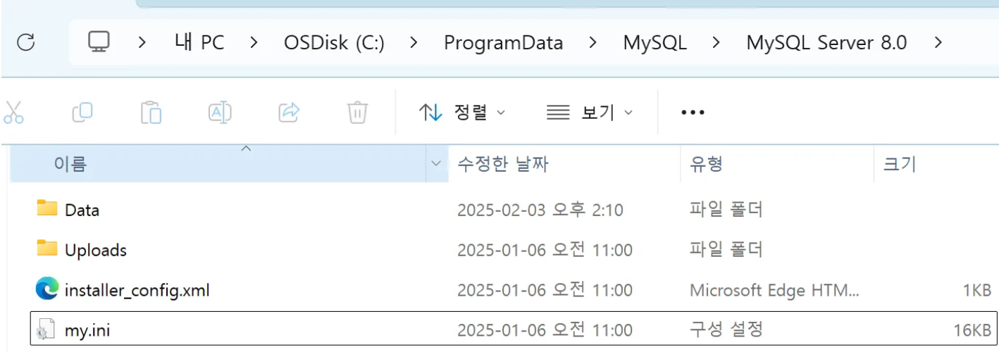 mysql에서 my.ini나 cnf파일을 찾으려면 C:ProgramData에 들어가야 한다. 이 때, 폴더에선 숨김 폴더 보기 설정을 켜줘야지 확인할 수 있다.