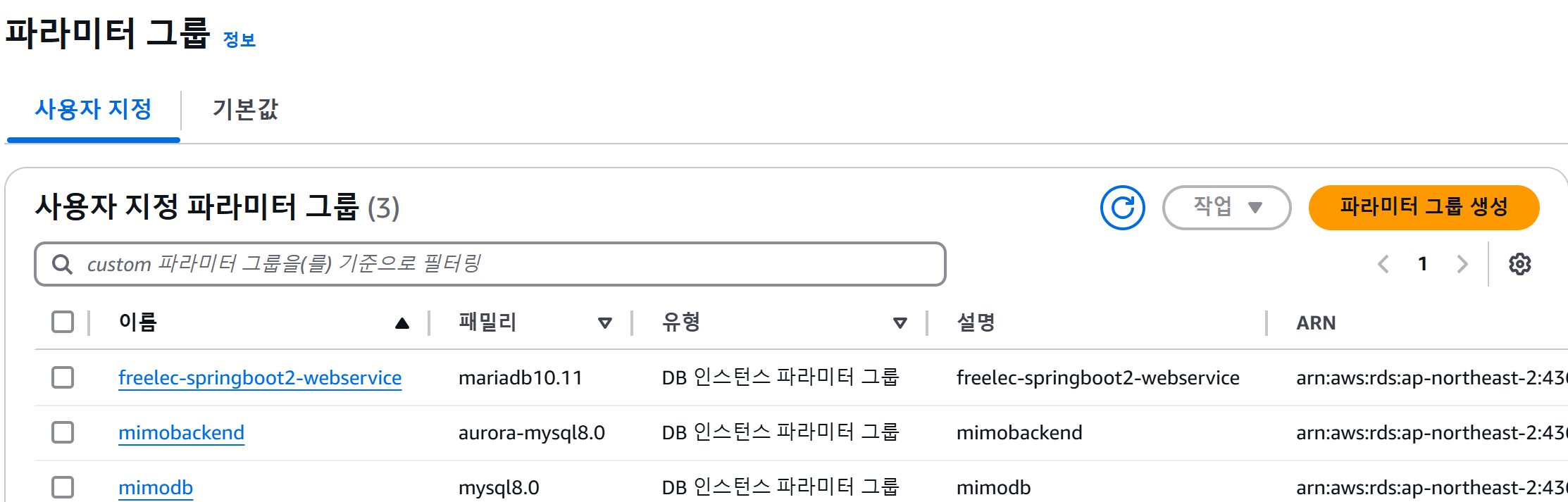내부에 들어가면 다음과 같이 파라미터 그룹이 나온다. 꼭 mysql8.0으로 들어가보자. aurora-mysql이나 mariadb의 파라미터는 다르다.