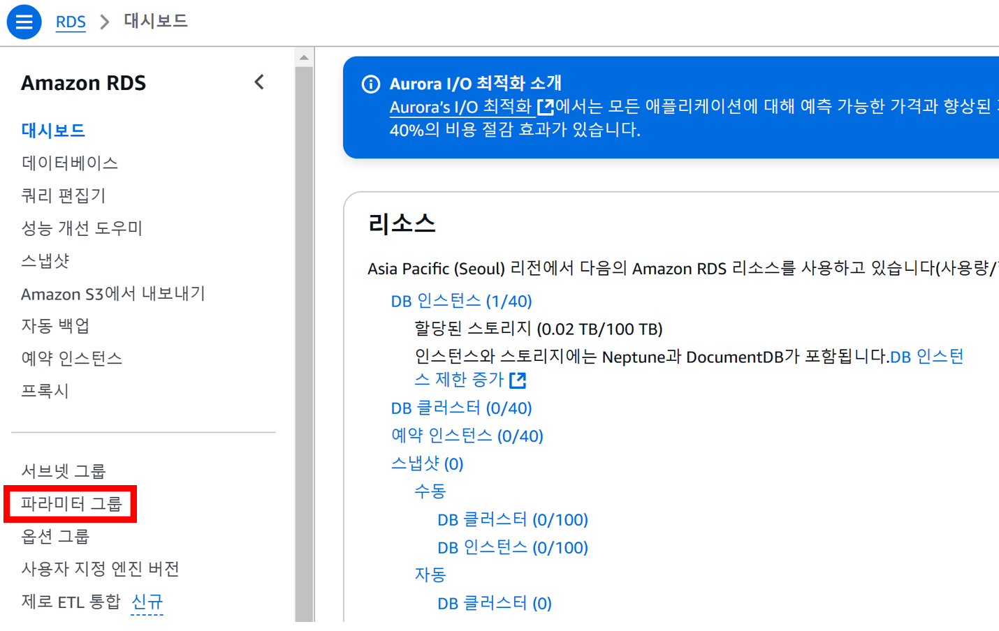 우선 FULLTEXT INDEX를 사용하기에 앞서 AWS RDS를 사용한다면 환경변수를 편집해야 한다. AWS에 로그인하고 RDS로 들어오면 파라미터 그룹이라는 게 보인다.