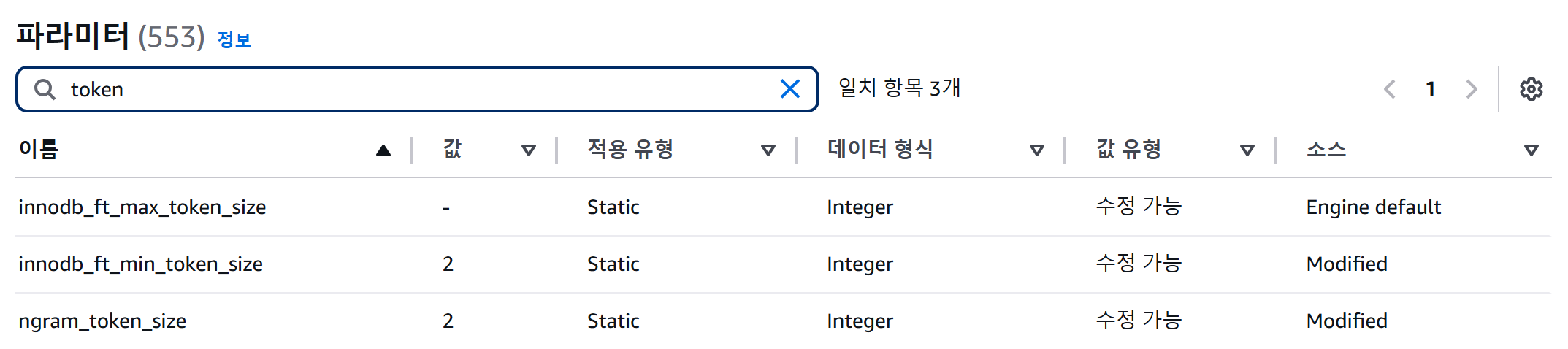 다음과 같이 파라미터 칸에 가서 ngram_token_size를 2로 변경하고, innodb_ft_min_token_size를 2로 변경하자. 또한, ft_min_word_len의 길이도 2로 변경하자.
