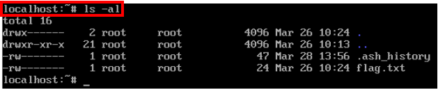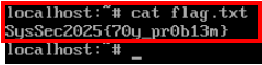 "cat" 명령어를 이용해 해당 "flag.txt" 파일을 읽어 플래그 값을 확인한다.