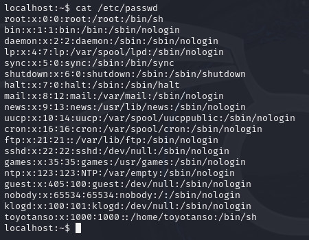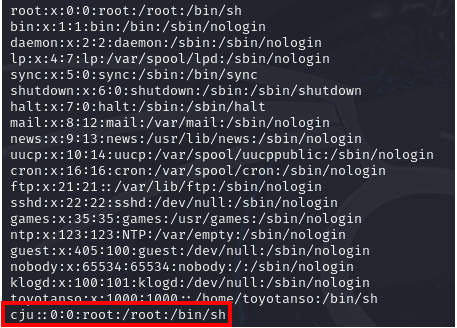 "cat" 명령어를 통해 /etc/passwd 파일을 확인한 결과,