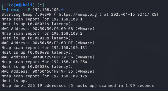 "Kali Linux"에서 nmap 명령어를 이용하여 192.168.100.* 대역대 스캔을 통해 현재 리눅스의 IP주소인 192.168.100.129를 제외한 192.168.100.131가 "SysSecAlpine"의 IP 주소임을 알 수 있다.