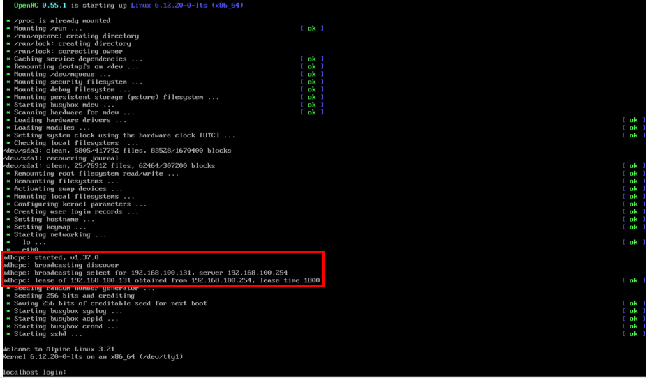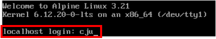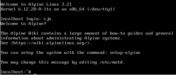주어진 "SysSecAlpine" 이름의 Alpine Linux를 실행하면 위와 같은 화면이 나타난다.
