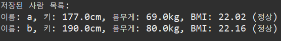 return "이름: " + name + ", 키: " + height + "cm, 몸무게: " + weight + "kg, BMI: "