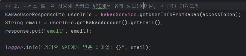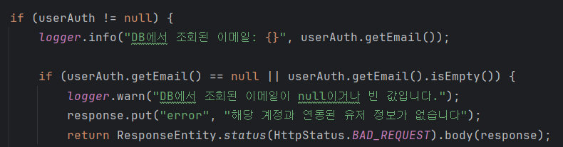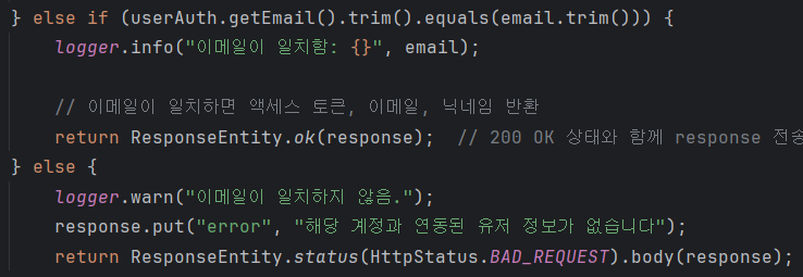 - 데이터베이스에서 조회된 이메일(userAuth.getEmail())과 카카오에서 받아온 이메일(email)이 일치하는지 확인