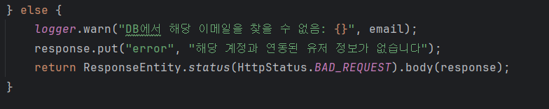 - 이메일 정보가 없거나 필드가 없으면 경고 로그 기록, 에러 응답메세지 출력