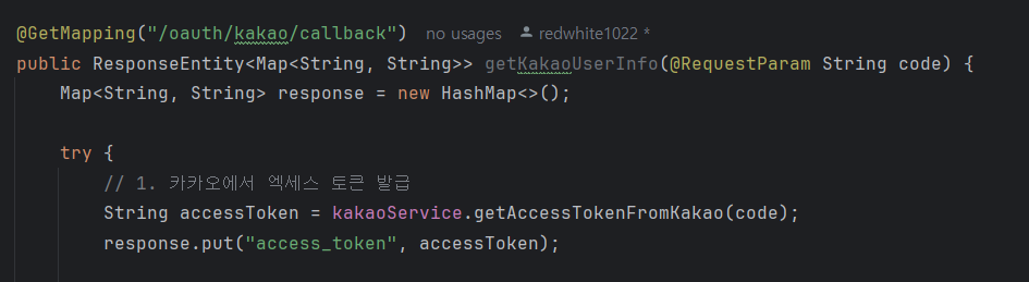 - 카카오 인증 코드를 이용해 엑세스 토큰을 발급받는 메서드