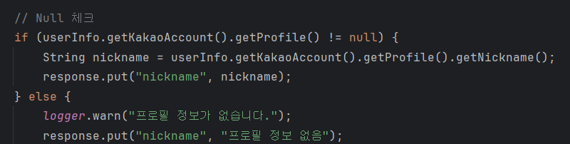 - 프로필 정보가 없을 경우, 경고 메시지를 로그에 남기고 "프로필 정보 없음"이라는 값을 response에 저장