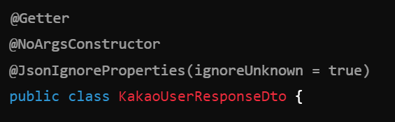 - 외부 클래스 KakaoUserResponseDto에 포함된 정적 내부 클래스로, 카카오 계정 정보를 표현