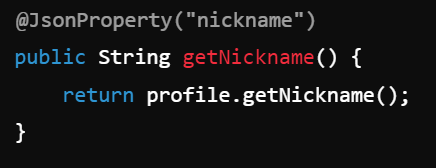 - 이 메서드는 JSON의 "nickname" 필드를 매핑하기 위해 사용됨