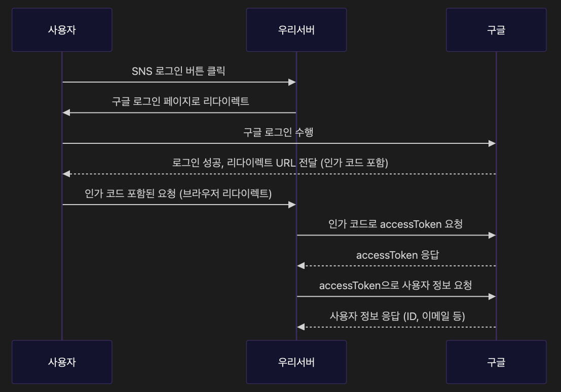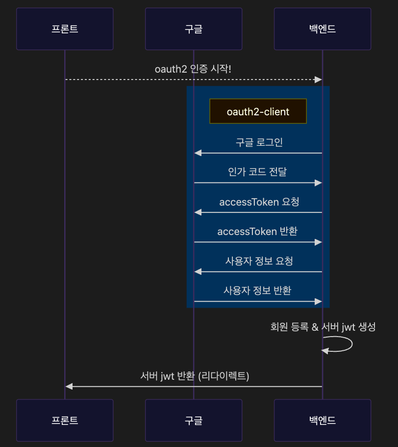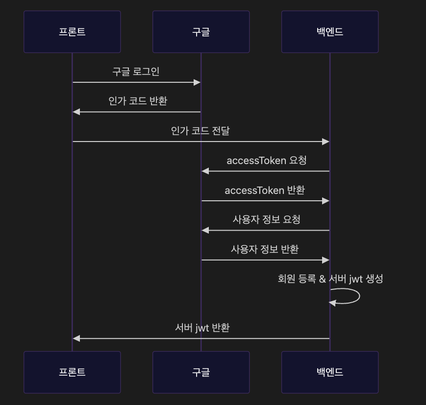 이후의 과정은 구글과 백엔드의 통신이다. 즉, 인가 코드를 프론트에서 받아 백엔드로 전달하는 부분이 차이점이다.
