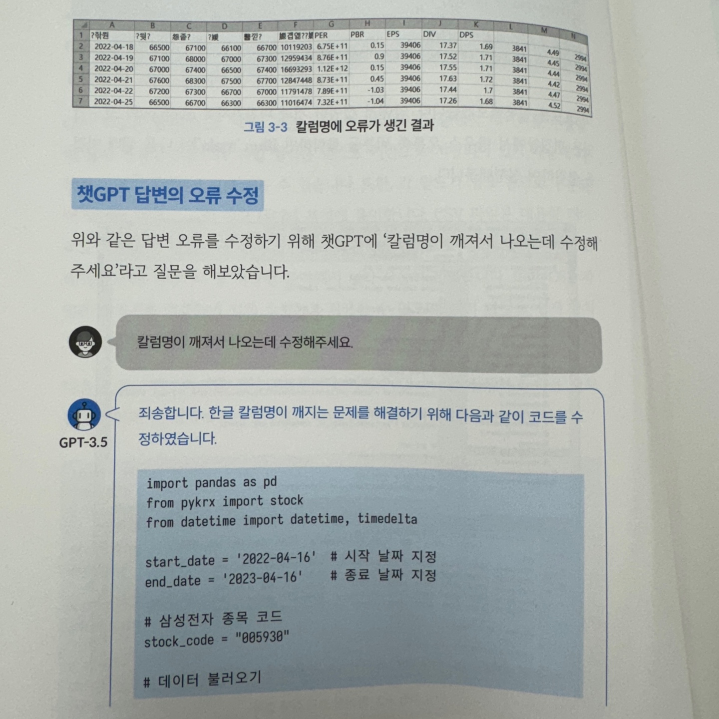 하지만 완벽한 코드는 아니에요! 실제로 사용해보면 에러가 발생하거나 컬럼이 깨져서 나오는 현상이 발생되기도 해요. 이 때도 어떻게 적절하게 챗GPT를 활용해 오류를 수정하는 지 알려줍니다.