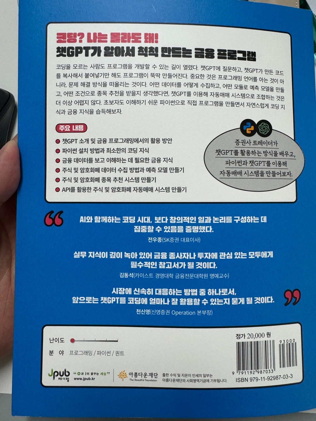 이 책의 가장 큰 장점은 이론에 그치지 않고 파이썬 코드와 함께 직접 시스템을 개발해 보면서 AI 기술을 금융에 접목시키는 노하우를 배울 수 있다는 점입니다. 책에 수록된 다양한 사례와 실습을 통해 금융 프로그래밍 역량을 키우고 싶은 분들께 추천합니다.