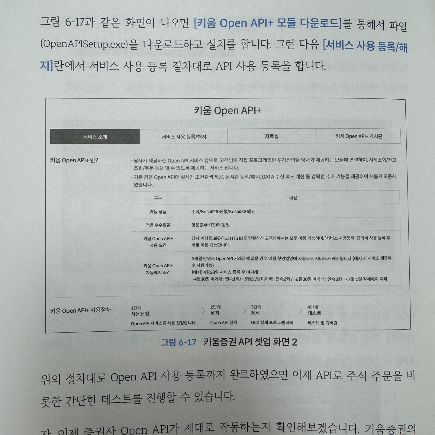 6장에서는 증권사와 거래소에서 제공하는 API를 활용하여 주식 자동매매 시스템을 개발하는 방법을 다루고 있습니다.