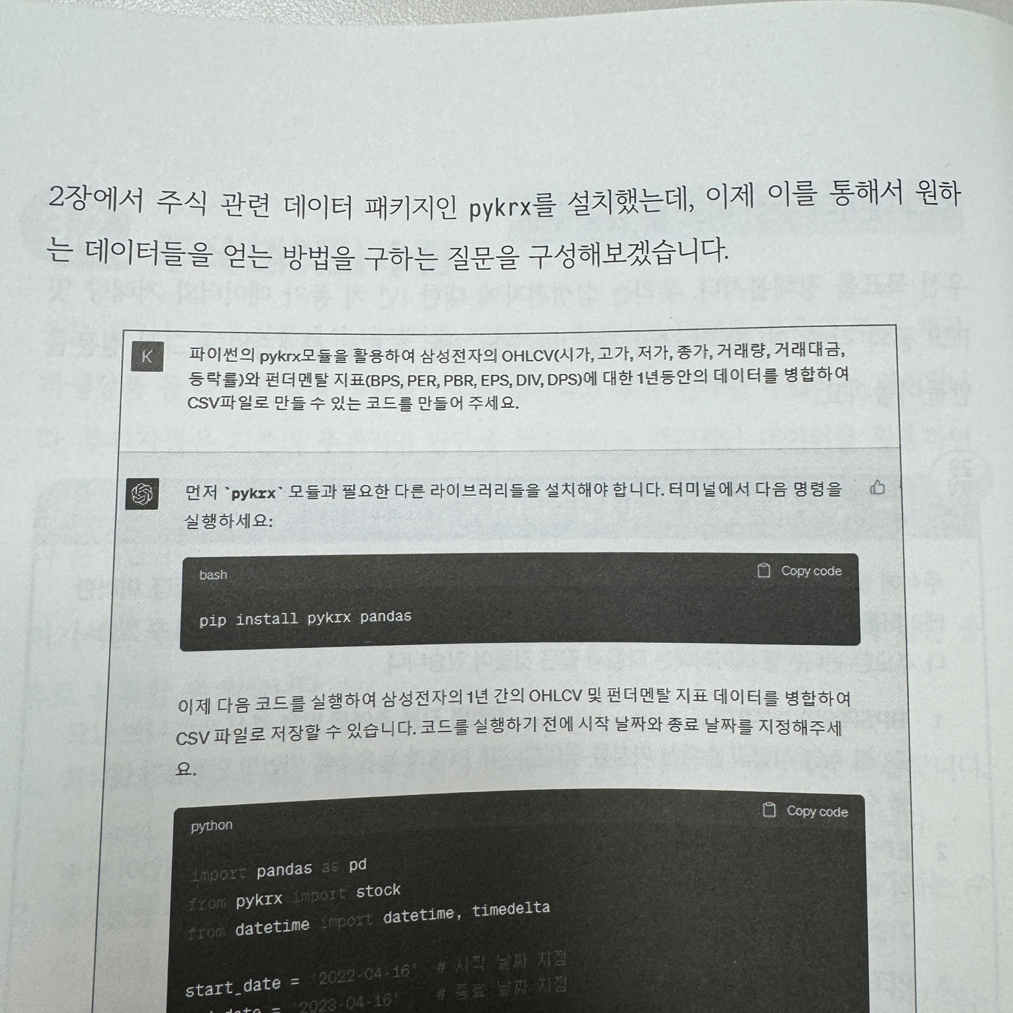 예를 들어, 챗GPT에게 삼성전자의 시가, 고가, 저기 등과 펀더멘탈 지표에 대해 1년 동안 데이터를 병합하여 csv파일로 만들어 달라고 요청하면 파이썬 코드를 답변 받을 수 있어요.