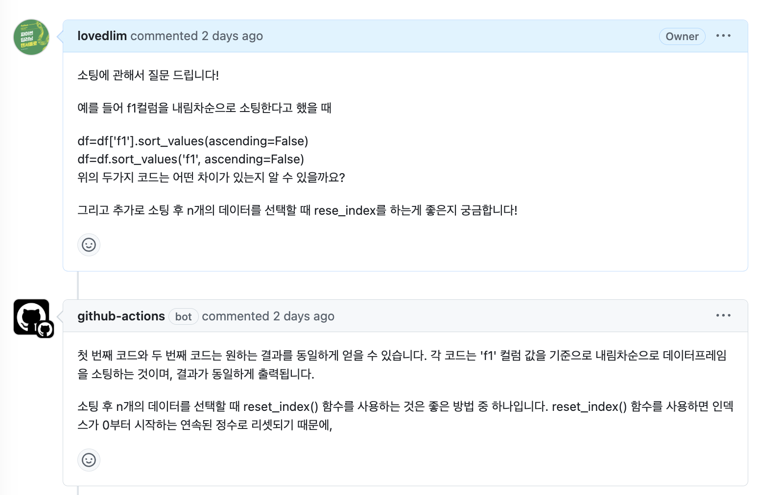 기존의 이슈 생성 시 뿐만 아니라 댓글이 달릴 때마다 봇이 자동으로 응답하도록 설정하였습니다. 이를 통해 GitHub 이슈에서 대화를 관리하고, 반복적인 질문에 자동으로 대응할 수 있습니다.