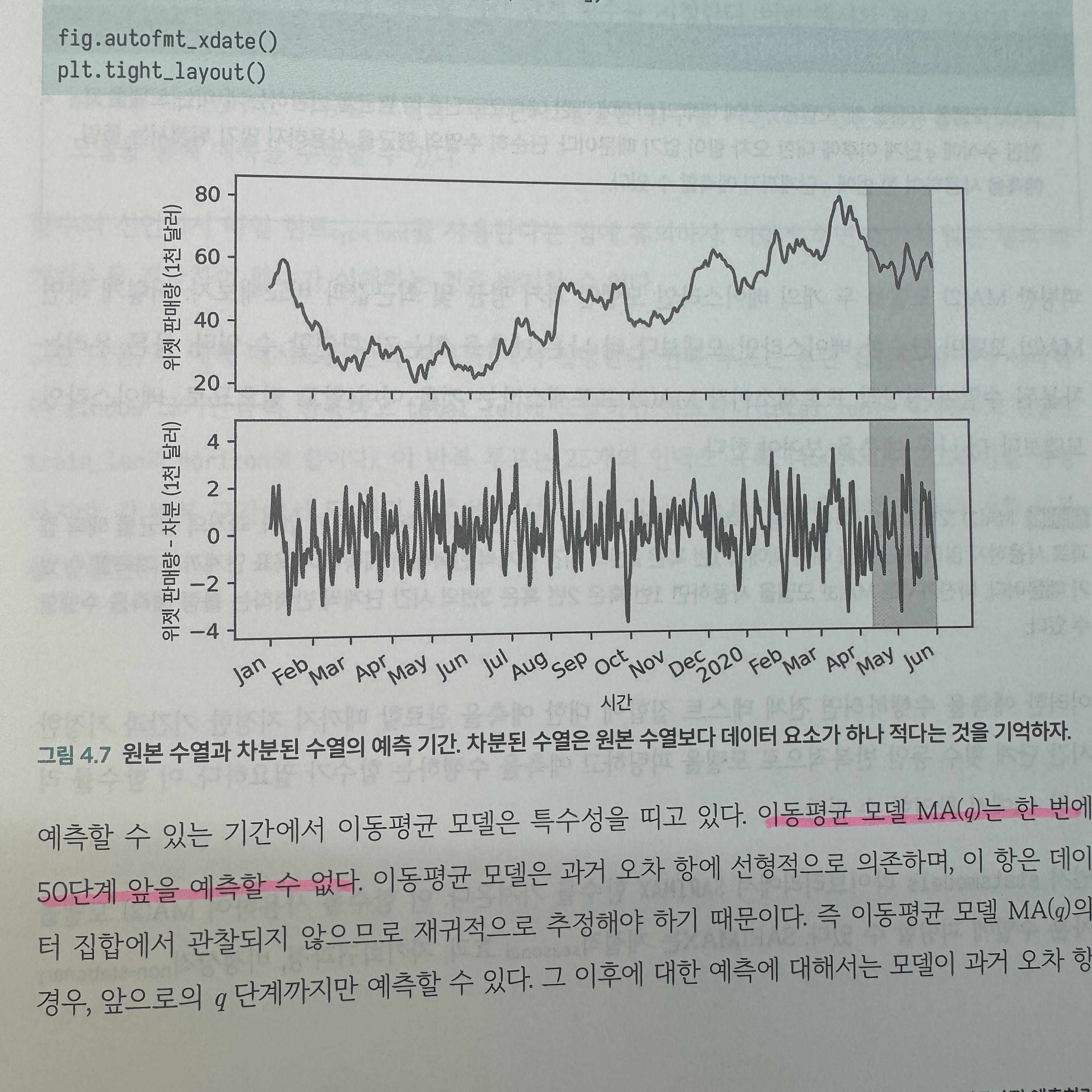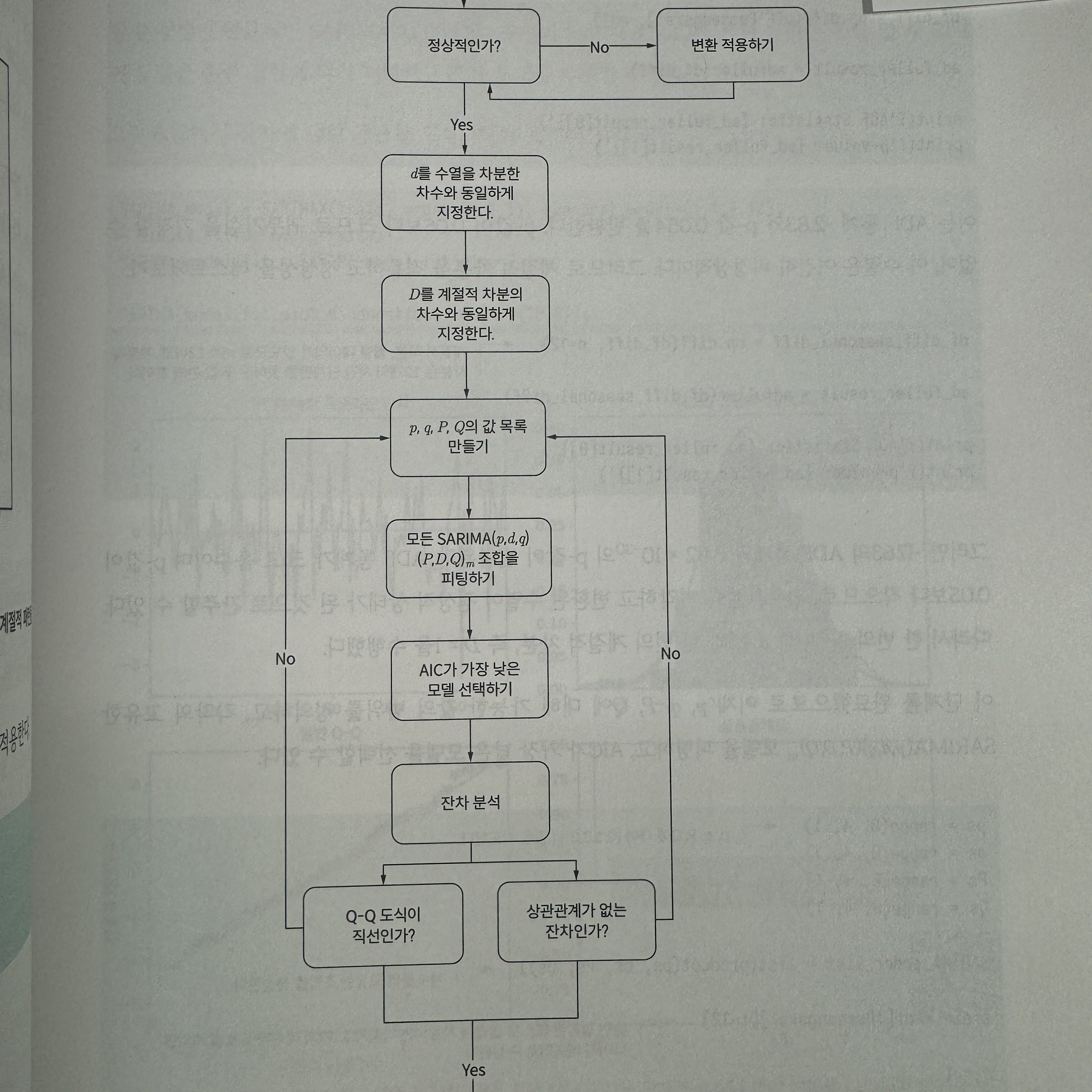 책 중간중간 반복적으로 비슷하지만 다른 모델링 절차 그림을 보여줍니다. 이는 독자가 전체 흐름을 파악하고 이해하는 데 큰 도움이 됩니다. 예를 들어, 이동평균 과정에서는 첫번째 데이터 수집부터 정상성 테스트, 수열이 정상이 될 때까지 차분, ACF 도식화, 유의미한 자기상관계수 찾기 등의 과정을 체계적으로 설명하고 있습니다. 개인적으로 구조화하는데 큰 도움이 되었어요!