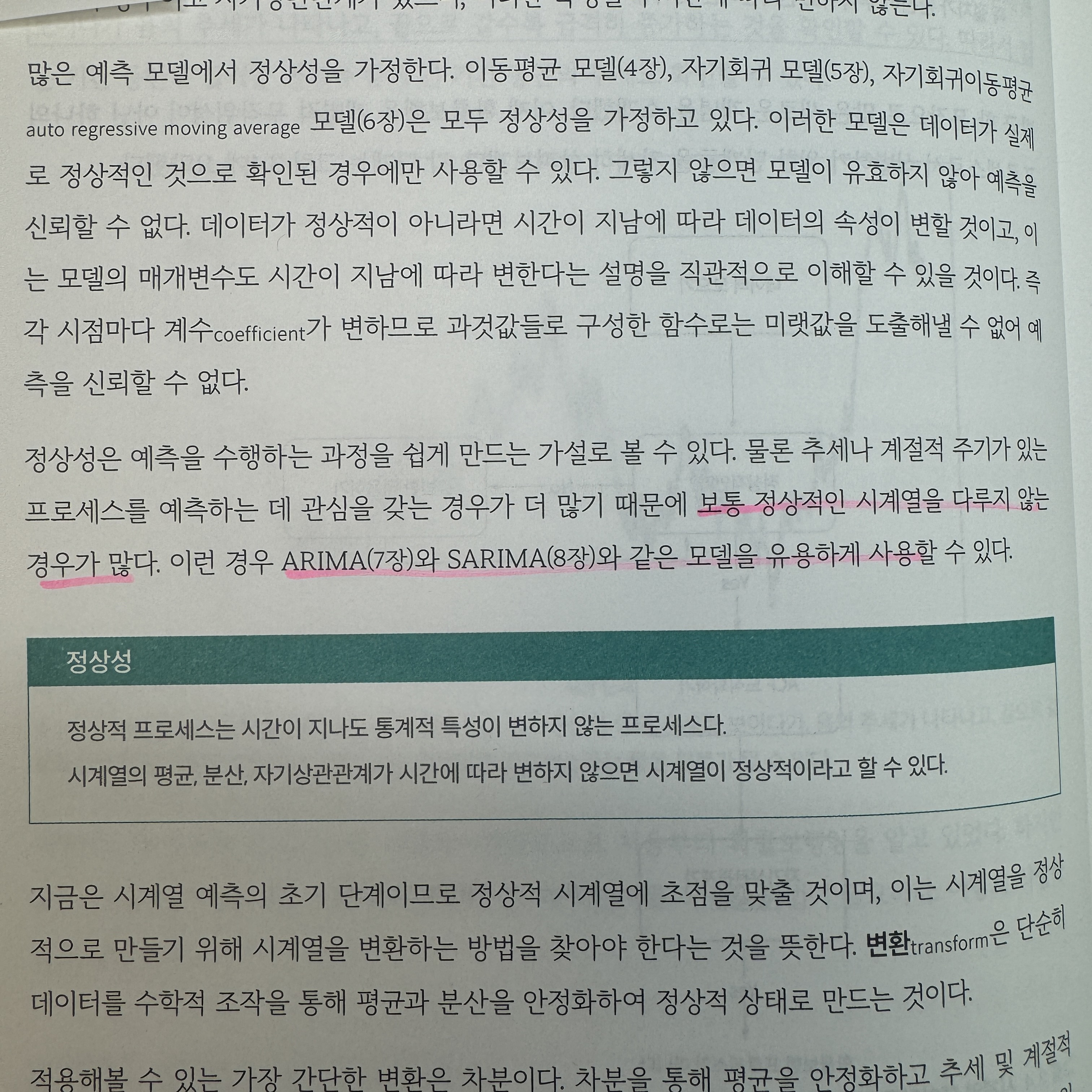 파트 1의 제목은 기술서적 느낌을 벗어나 스토리가 있는 듯한 주제를 담고 있으며, 내용에도 흐름이 있습니다. 기술 서적에서도 흐름 있는 책을 선호하는데, 이는 기초를 다질 때 머릿속에 구조화하기 쉽기 때문입니다. 이 책은 시계열 기초를 탄탄하게 다루고 있어, 저자의 세심한 배려와 이해를 돕는 설명 덕분에 시계열의 기초 개념을 쉽게 파악할 수 있습니다.