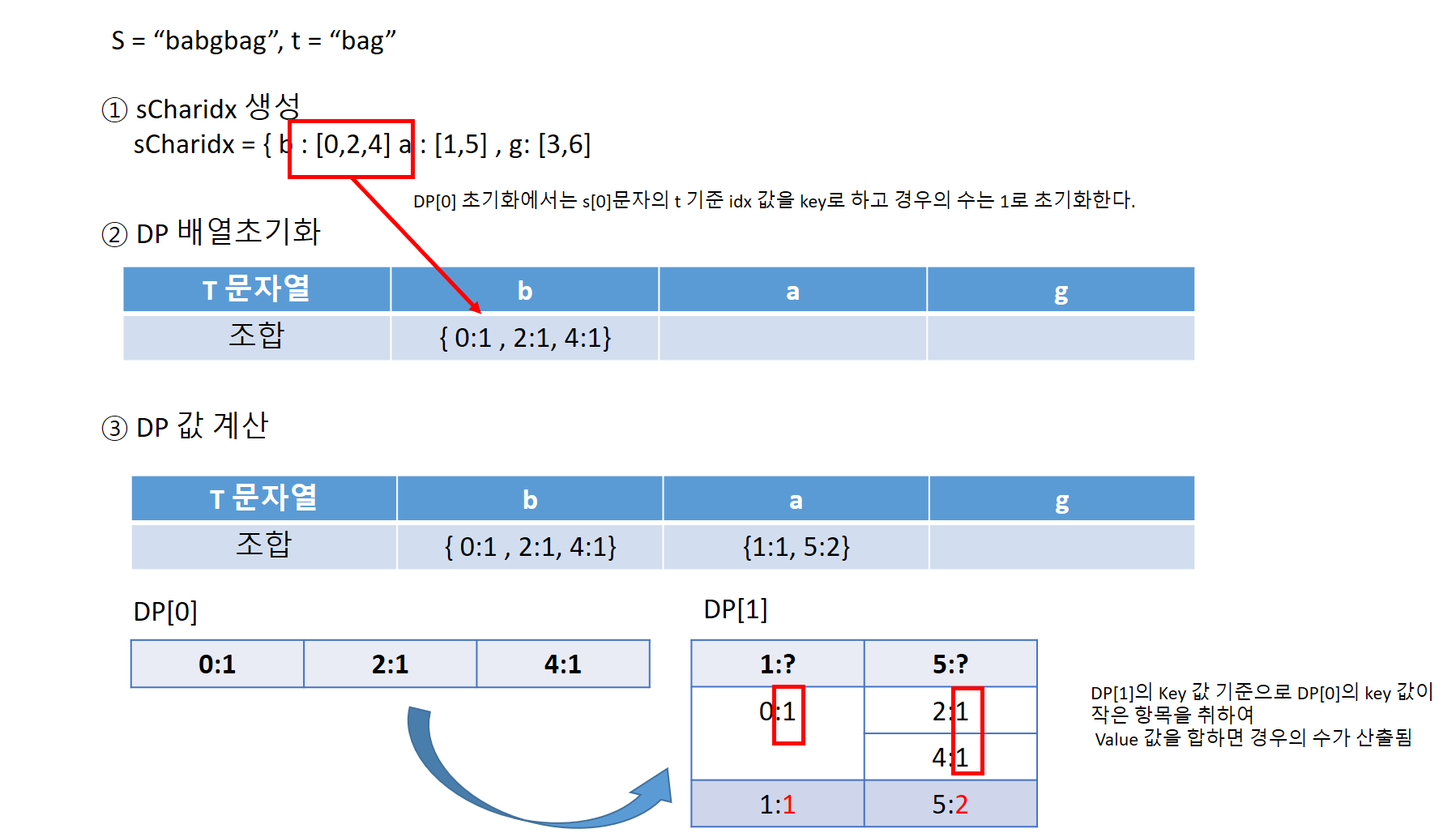 dp 배열을 생성하여 DP 테이블을 초기화한다. 이 dp 배열은 len(t)의 크기만큼의 defaultdict(int) 객체들의 리스트로 구성되어 있다. 각 dp[i]는 t의 i번째 문자까지를 대상으로 해서 문자열 s에서 t를 만들어내는 경우의 수를 저장한다. 초기 단계에서는 첫 번째 문자인 t[0]을 기준으로 각 문자가 나타나는 인덱스들을 sCharidx에서 가져와 dp[0]에 저장한다.