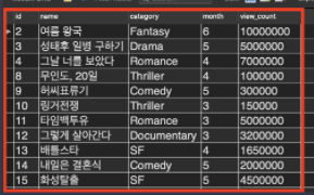 테이블에 id(PK), name, category, month, cie_count 컬럼이 있다.