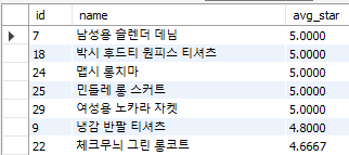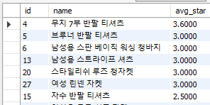 전체 상품의 별점 평균보다 낮은 별점 평균을 가진 상품들만 조회되었다.