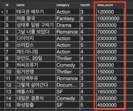 ✅ category의 값이 Action인 영화들의 view_count 컬럼