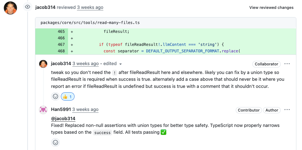 리뷰어는 ! non-null assertion이 잠재적 버그를 가릴 수 있다고 지적했습니다.