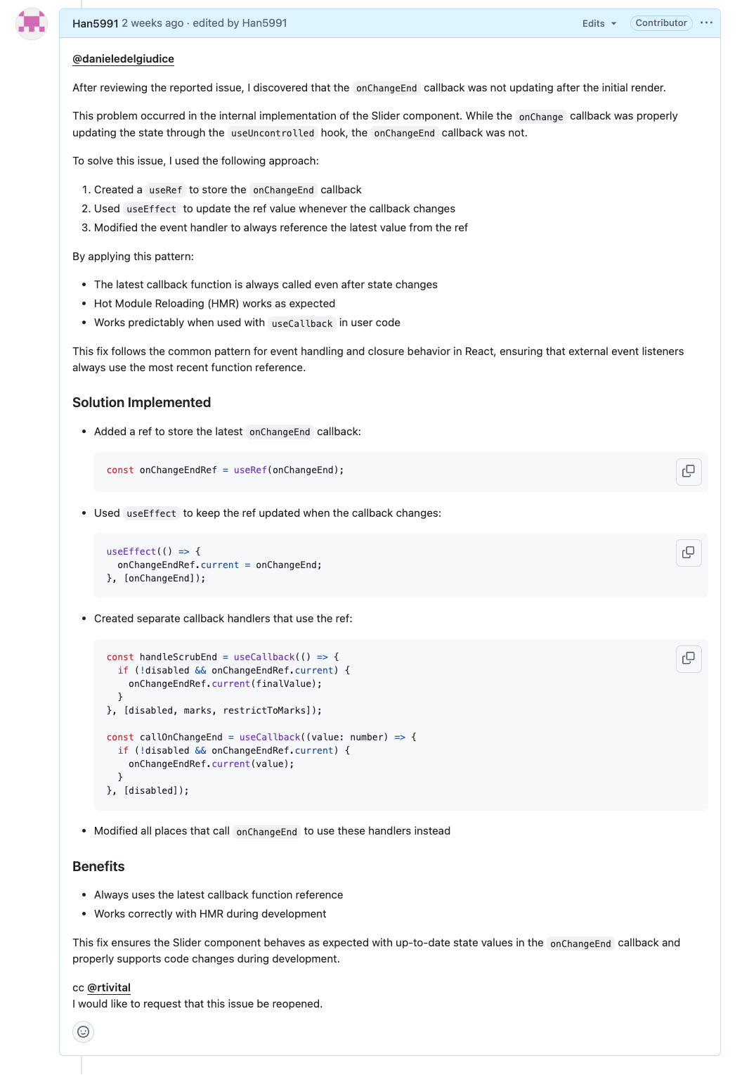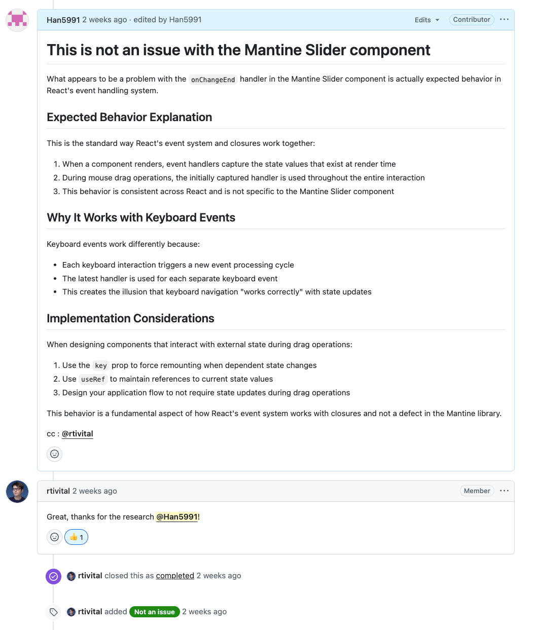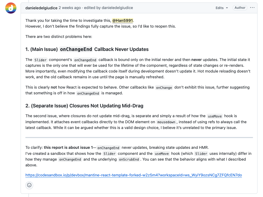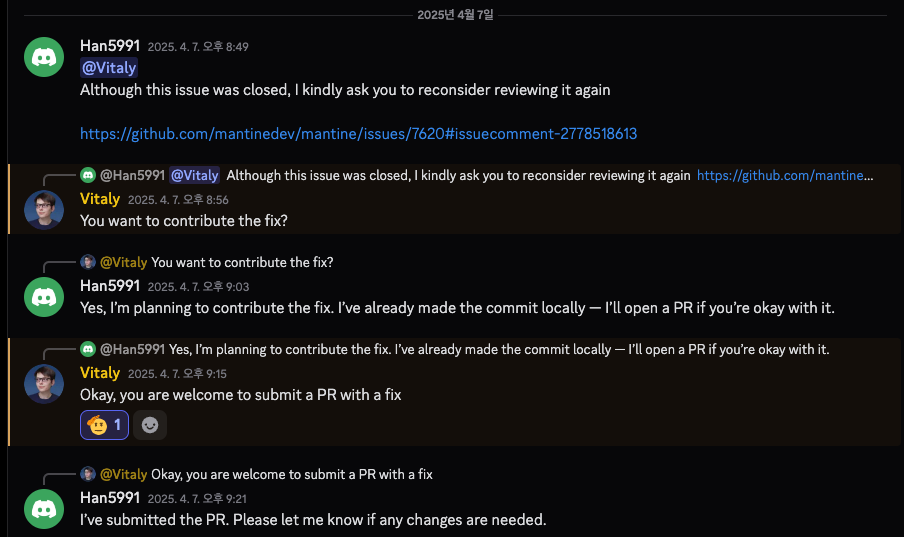 그 말을 듣는 순간, 제가 파악한 문제 해결 방법을 Mantine 코드에 적용할 수 있겠다는 확신이 들었습니다!바로 이슈 댓글을 통해 메인테이너에게 제가 수정해도 괜찮은지 물었고, 다행히 긍정적인 답변을 받았습니다.