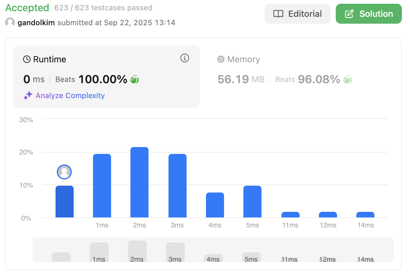 그러나 상위 94%라는 기적적인 실행시간(와!9등급!!)을 보고 개선이 필요하겠구나 싶었다.