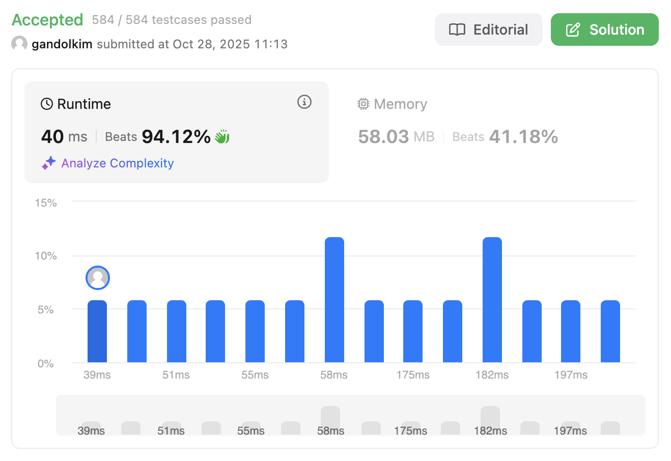 처음엔 실행시간이 55ms 정도 나와서 줄여보려고 최적화 할 수 있는 부분을 보다가 if 문 안의 조건식을 gap >= -1 && gap <= 1 && nums[i] === 0 에서 nums[i] === 0 && gap >= -1 && gap <= 1 로 바꿨더니 실행시간이 확 줄었다. 역시 조건식이 여러개일 때에는 단락 평가 를 신경써야 한다.