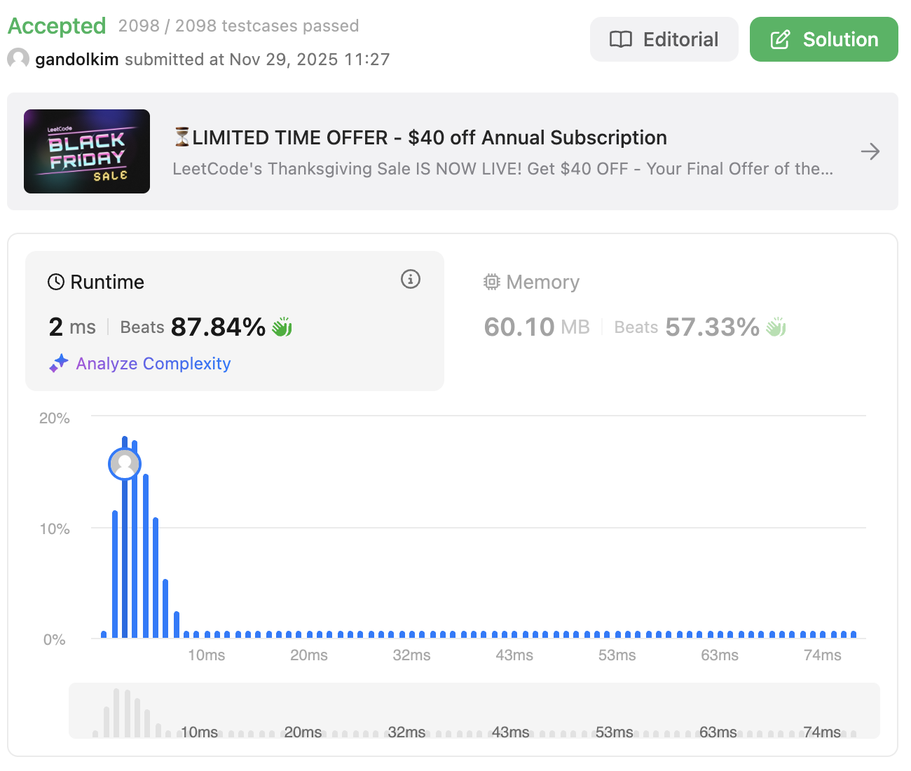 두 배열이 이미 정렬된 상태이기 때문에 앞에서부터 두 배열의 원소들을 비교해나가면서 중앙값 까지만 계산하면 된다. 따라서 시간복잡도 O(log(nums1.length + nums2.length)) 에 끝낼 수 있다.