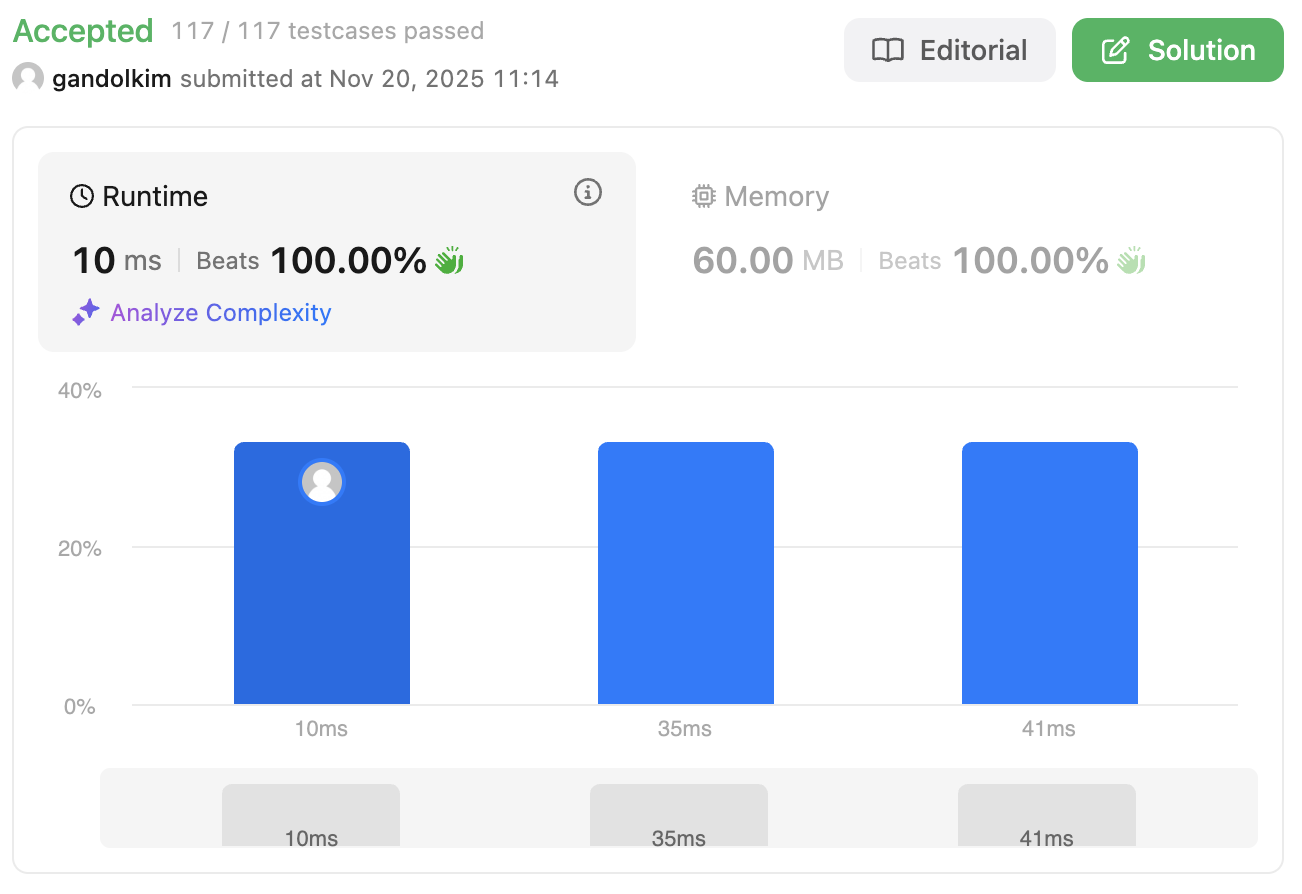 먼저 간격들을 정렬해야 하는데 다행히 intervals의 길이 최댓값이 3000 이라 편하게 .sort() 를 했다.end 가 작은 순서부터, 그리고 end가 같다면 start 가 큰 순서부터 오도록 정렬했다. 어차피 end, end -1 두 개만 배열에 들어가면 되기 때문에 end 가 같다면 start 는 얼마나 길던지 상관없다.