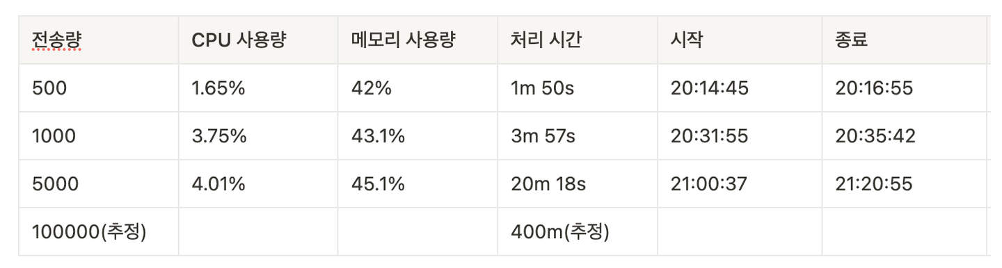 일단 알림 갯수가 늘어날 때 현재 서비스에서 어떻게 처리될지 확인하기 위해, 알림 갯수를 동시에 500개, 1000개, 5000...최종적으로 10만개씩 보내며 어떻게 처리되는지 확인해보고자 했다.