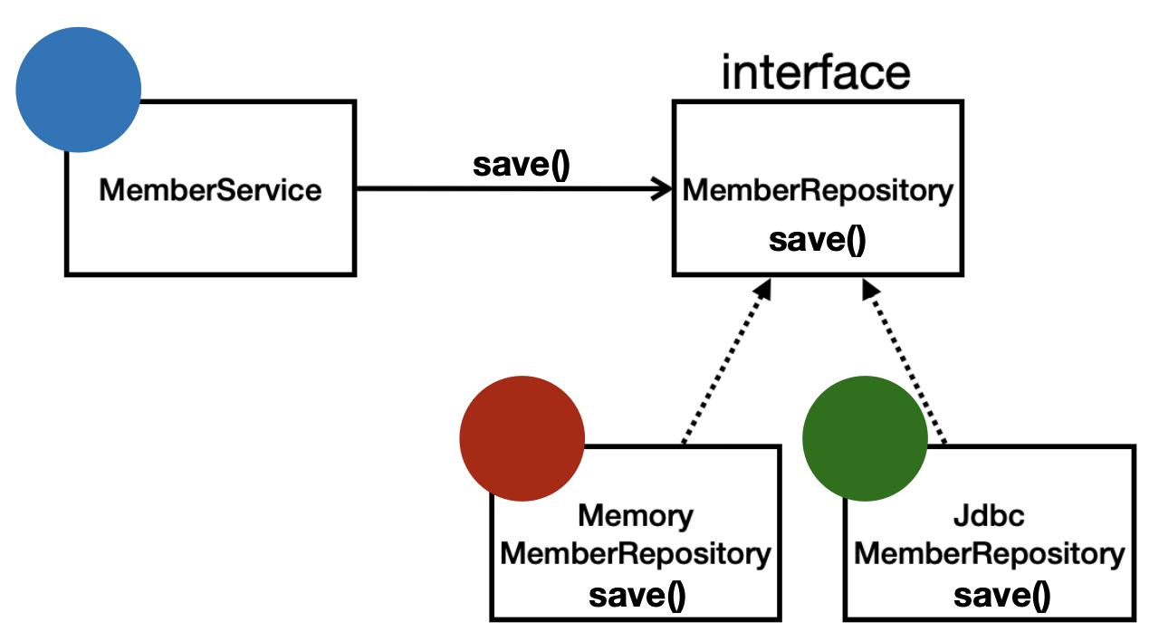위 사진의 경우 MemberRepository라는 역할을 부여하고, 그 역할을 수행하는 구현 객체인 MemoryMemberRepository와 JdbcMemberRepository를 만들었다.