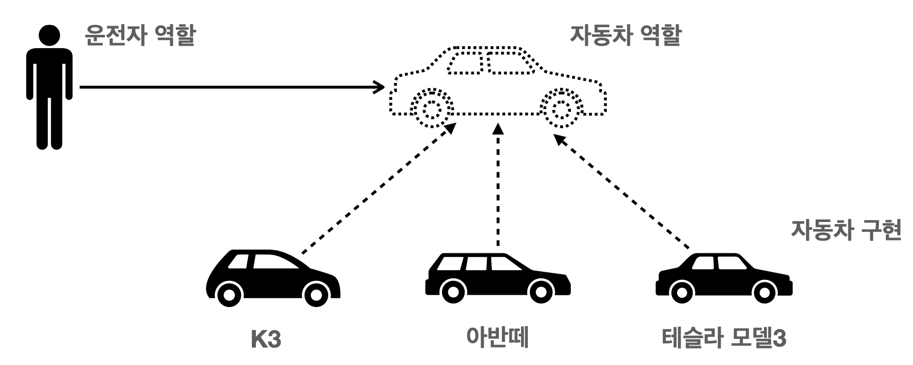 자동차는 차종이 바뀌어도 자동차의 역할(운전자의 이동을 도와줌)은 바뀌지 않는다. 운전자는 이러한 자동차의 내부를 몰라도 된다. 가령 자동차의 내부가 바뀐다 해도 자동차의 역할은 바뀌지 않고 그대로이다.