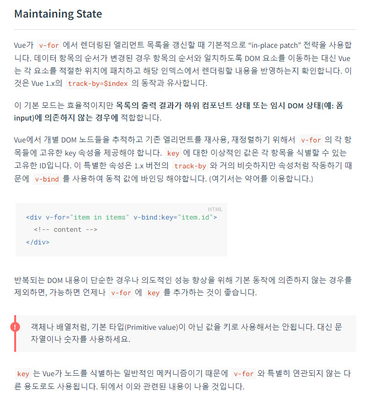 Do it!(Vue.js)에서 TodoList를 만들때 v-for를 써야하는 부분에서 오류가 나와 찾아본 결과 오류 부분과 Doc에도 이렇게 작성이 되어 이렇게 해주었더니 리스트가 잘 나왔다.