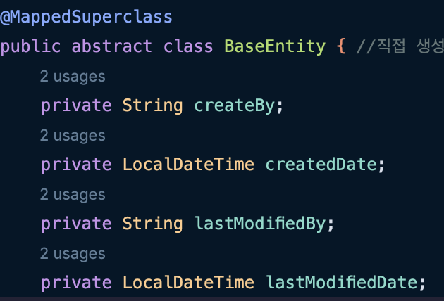 주로 등록일, 수정일, 등록자, 수정자 같은 전체 엔티티에서 공통적으로 적용하는 정보를 모을때 사용한다.